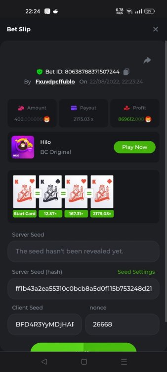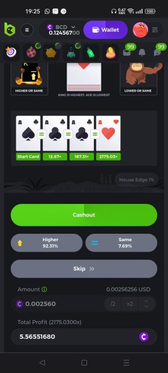 1. Hi fellow Hi-Lo's. Got lucky with 4 A & K .... And! I hit an almost 5000x Please see betlink to view/verify. https://bc.game/#/sd/10XNMKKTI9XXQR Hi everyone I got lucky with Kings and Aces Also had a great win with my almost 5000x multiplyer: here is the betlink https://bc.game/#/sd/10XNMKKTI9XXQR