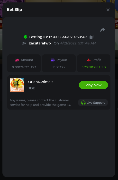 Golden Dancing Lion x 177.2 Betting ID: 1724947781266571904 Hit the Gold! x 44.8 Betting ID: 1724948222505448576 Tiger Jungle x 93 Betting ID: 1725143498319811079 Solar Queen x 47 Betting ID: 1725006049288958592
